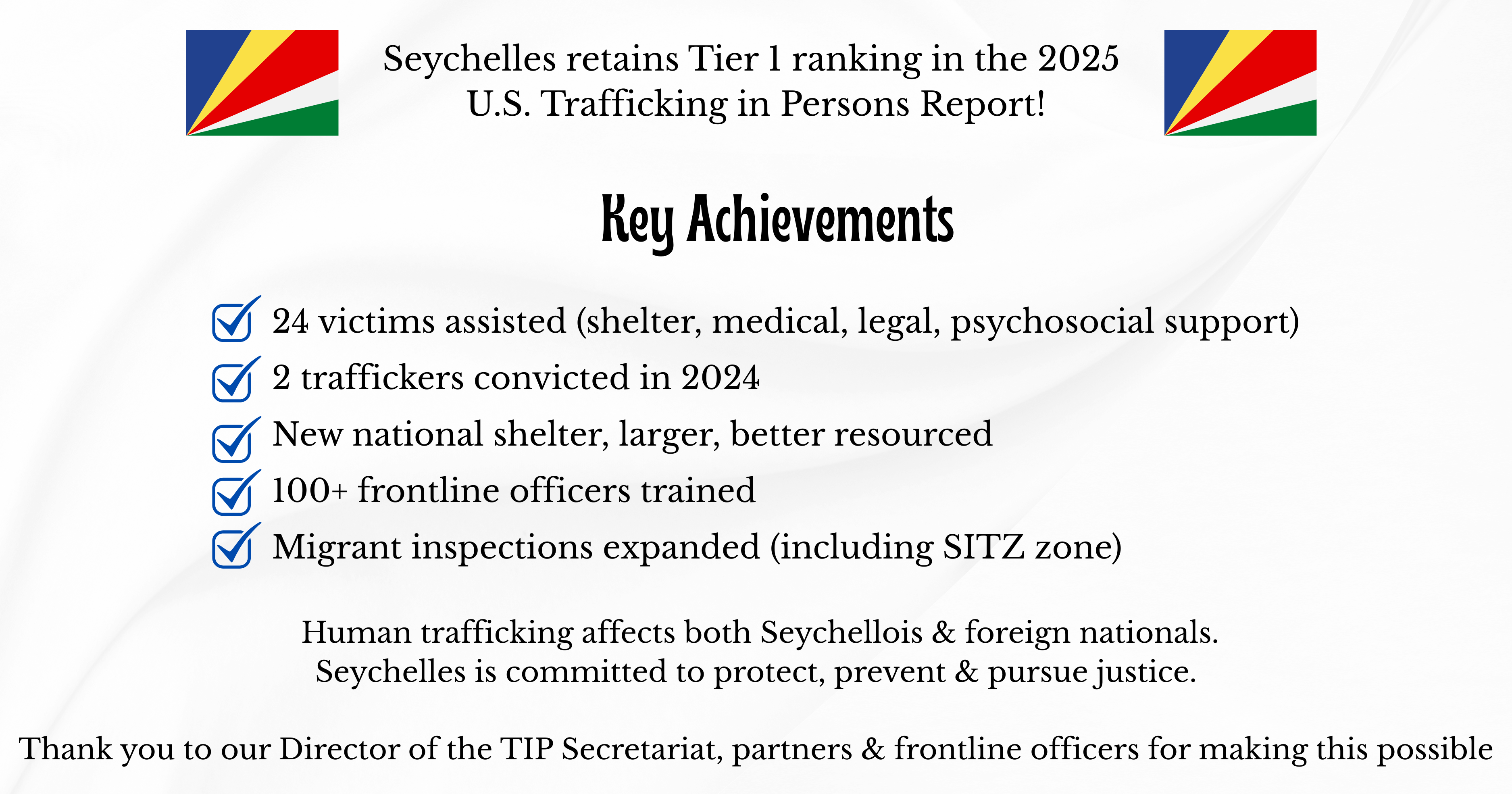 “This recognition is a proud moment for Seychelles and a testament to our collective determination to protect the most vulnerable members of our society. We remain fully committed to ensuring that the fight against human trafficking continues to be a national priority, guided by strong laws, effective enforcement and the spirit of partnership.”