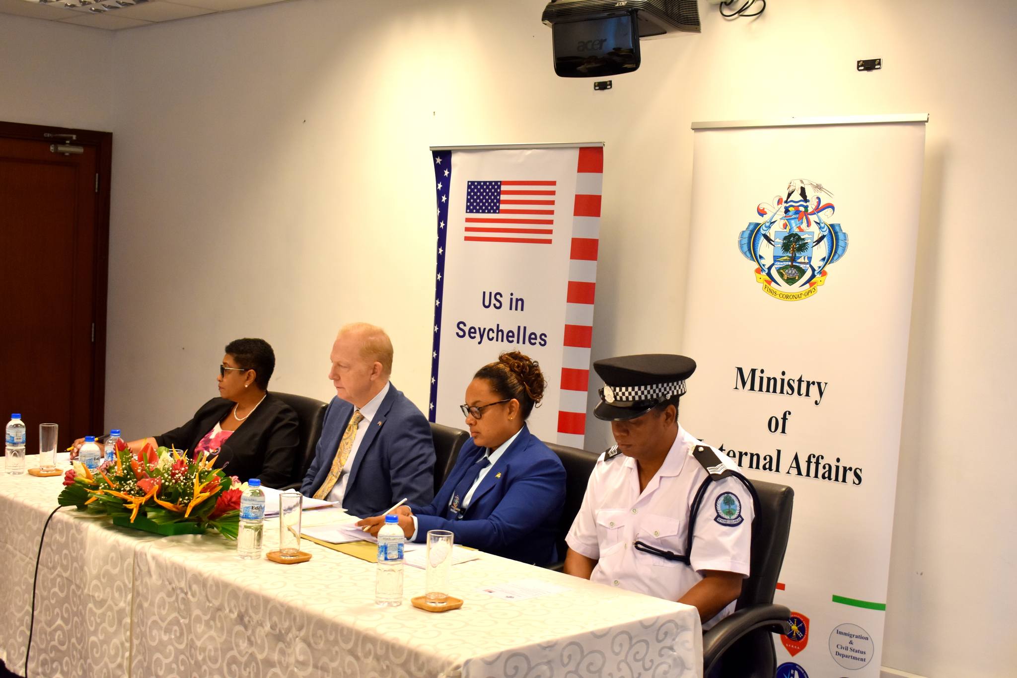 During the press conference, representatives from both the Ministry of Internal Affairs and the U.S. Embassy praised the efforts of Seychelles in maintaining its’ measures to prevent human trafficking, protect victims and prosecute offenders. The panel consisted of the U.S. Ambassador to Seychelles Mr. Henry Jardine,Principal Secretary of the Social Affairs Department and Chairperson of the National Coordinating Committee against Trafficking In Persons Mrs. Linda William-Melanie, Director of the Trafficking In Persons Secretariat, within the Ministry of Internal Affairs Ms. Michele Sabury and Sergeant Davis Simeon from the Seychelles Police.