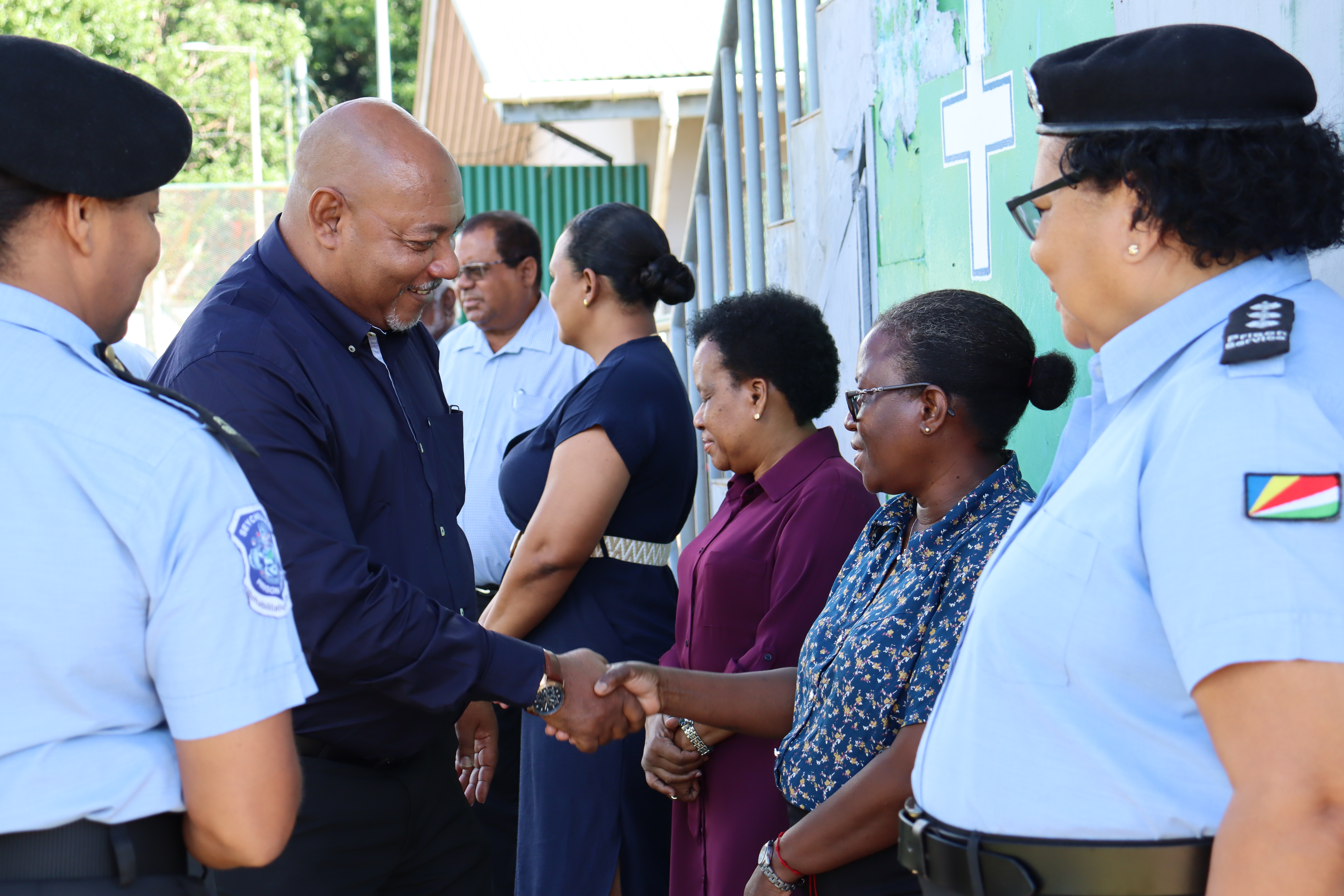 Minister Camille began the day at the Seychelles Police Headquarters, where he was received by senior leadership and met with several police officers and personnel , he then proceeded to meet officers from the Anti-Terrorism and Quick Response Unit, the Marine Police Unit, the Financial Crime Intelligence Unit, the Commercial Crime and Compliance Unit, the Perseverance Police Station and the Perseverance Remand Centre of the Seychelles Prison Services.