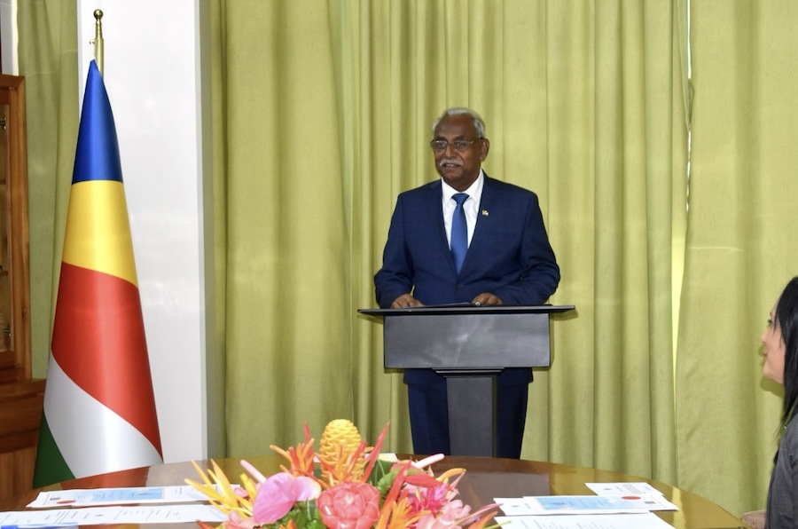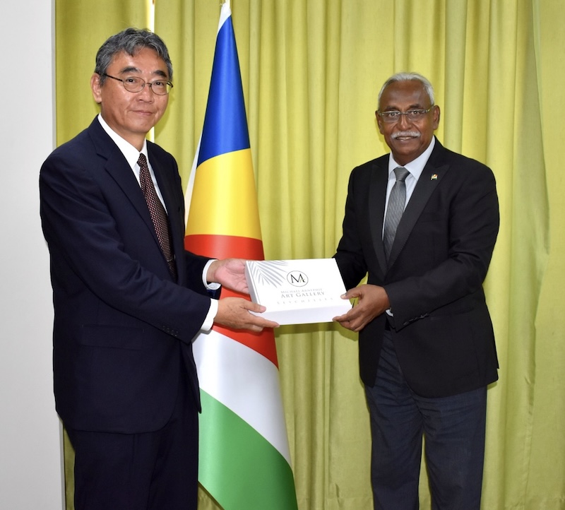 The Minister of Internal Affairs welcomed the Chargé d’Affaires of Japan to Seychelles H.E Eiji Kato in a farewell courtesy call today. During the meeting the Minister expressed his gratitude towards Ambassador Kato and wished him the very best of luck in his future endeavours. Discussions focused on various subjects in enhancing the diplomatic relations between the two nations. The Minister ended the meeting by presenting a farewell gift to Ambassador Kato.